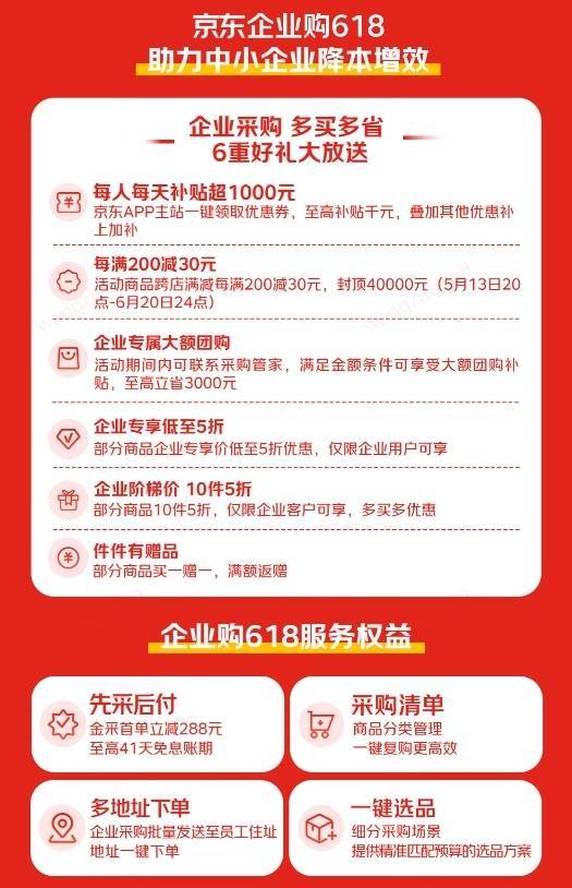 同时,京东企业购还为企业客户提供了包含每日千元补贴、跨店满减每满200减30元、大额团购补贴至高立省3000元、企业专享价低至5折、部分商品买一赠一、企业阶梯价10件5折,以及先采后付、采购清单、多地址下单、一键选品等权益的10大惊喜,进一步助力企业客户降本增效,实现“多买多优惠、多买多省心”。